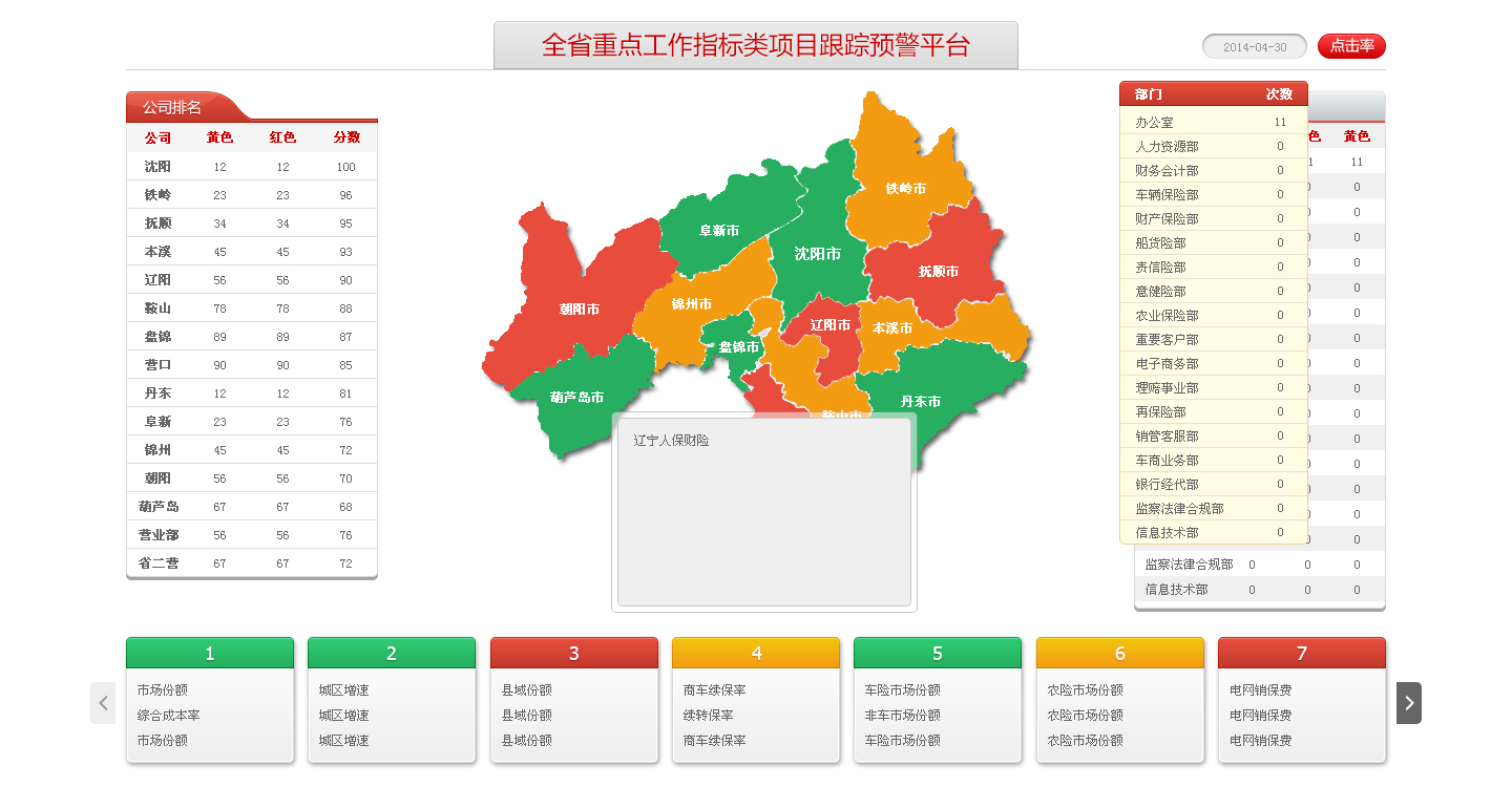 系統(tǒng)分為八個(gè)不同的主要項(xiàng)目進(jìn)行預(yù)警,在遼寧省地圖上根據(jù)滯后程度不同予以顏色上的展示。使用者一目了然。